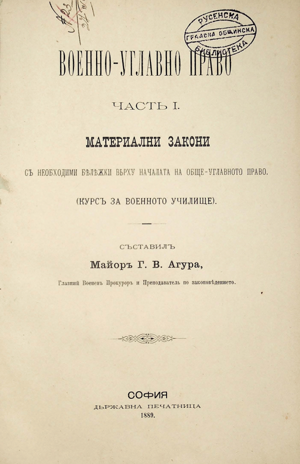 Военно-углавно право Курс за воен. у-ще : Ч. 1 - състав. Георги Василиевич Агура. Ч. 1 Материални закони с необходими бележки върху началото на общо-углавното право