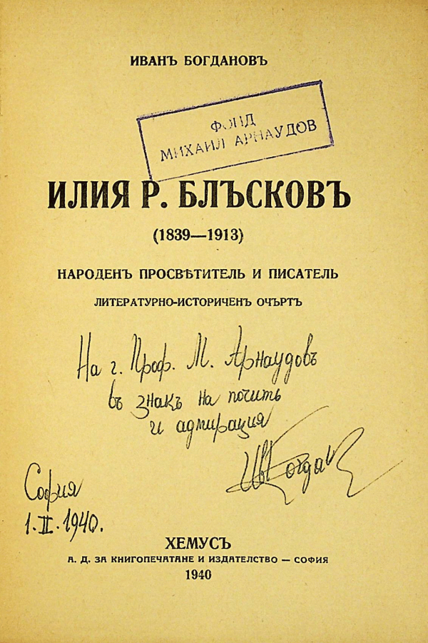 | Регионална библиотека "Любен Каравелов" Русе Фонд "Михаил Арнаудов" | МА 1676 (Разгледайте рафт(Отваря се отдолу)) | Автограф: Иван Богданов | 5 | Специални фондове ( старопечатни, редки и ценни, фонд М. Арнаудов) (само за читалня) | 120000590773 |