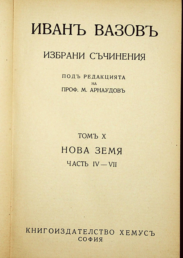 Избрани съчинения Т. 1 - 12 Иван Минчов Вазов; под ред. на Михаил Петров Арнаудов. Т. 10, Ч. 4-6 Нова земя