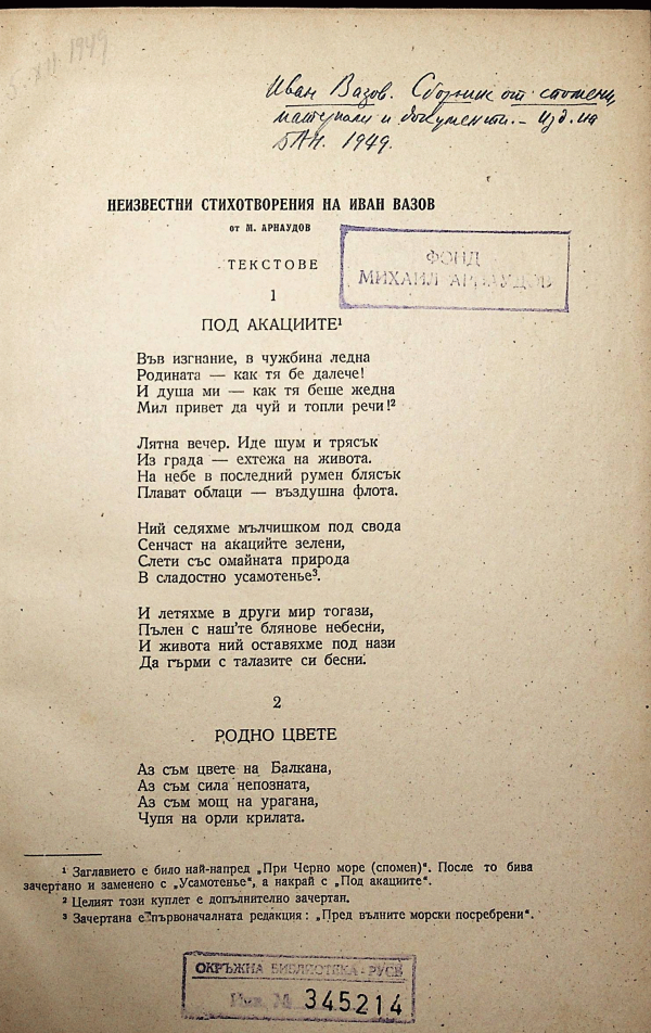 Неизвестни стихотворения на Иван Вазов Михаил Петров Арнаудов.