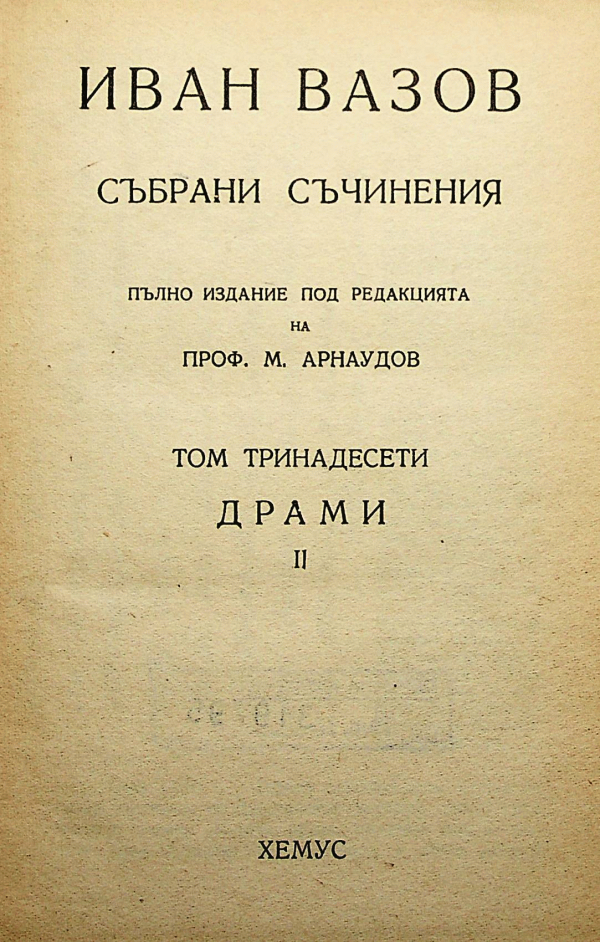 Събрани съчинения Пълно изд. под ред. на проф. М. Арнаудов : Т. 1 - Иван Минчов Вазов; * Михаил Петров Арнаудов. Т. 13 Драми - Ч. 2