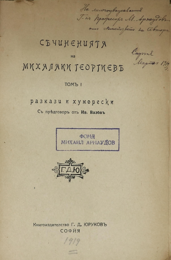 Пълното име на авт. Михалаки Георгиев Лозанов. - Автограф с текст: На многоуважаемий г-н професора М. Арнаудов от семейството на автора. София март 1919 г.