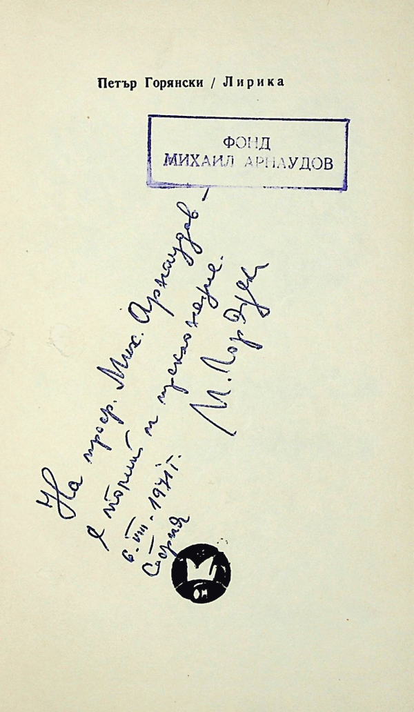 Фонд Михаил Арнаудов - Автограф с текст: На проф. Мих. Арнаудов - с почит и преклонение. 6. VІІІ. 1971 г. София П. Горянски. - Твърда подв.