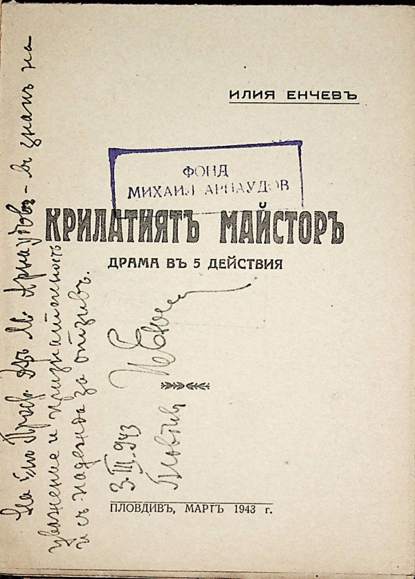 Пълното име на авт. Илия Енчев Тодоров. - Автограф с текст: На г.н Проф. Д-р М. Арнаудов - в знак на уважение и признателност и с надежда за отзив. 3. ІІІ. 943 Пловдив Ил. Енчев. - Мека подв., неразрязана
