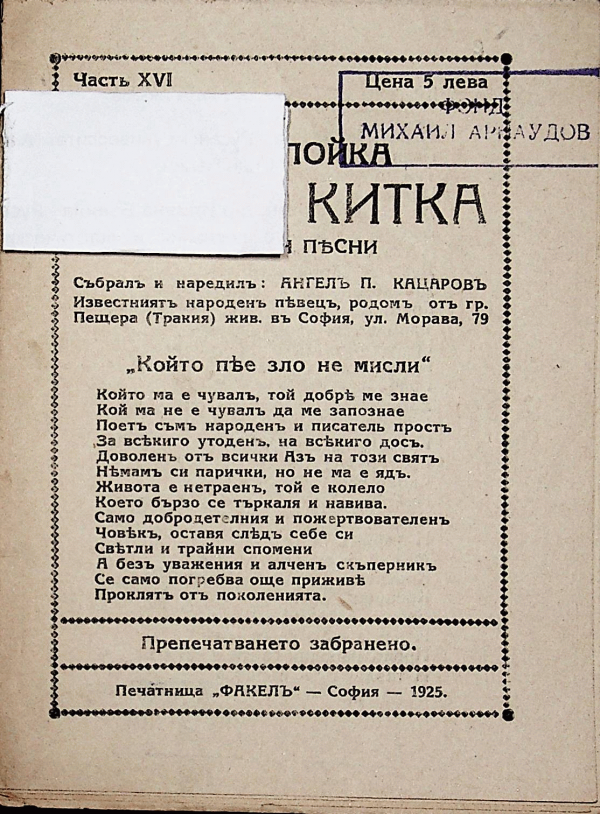 Песнопойка Златна китка с по-отбрани народни, старонародни, любовни и хороводни песни Ч. XVI