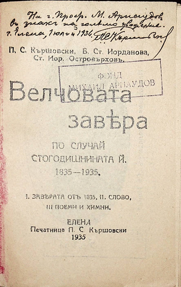 Автограф с текст: На г. Проф. М. Арнаудов в знак на голямо уважение. г. Елена, 1 юлий 1936. П. С. Кършовски;