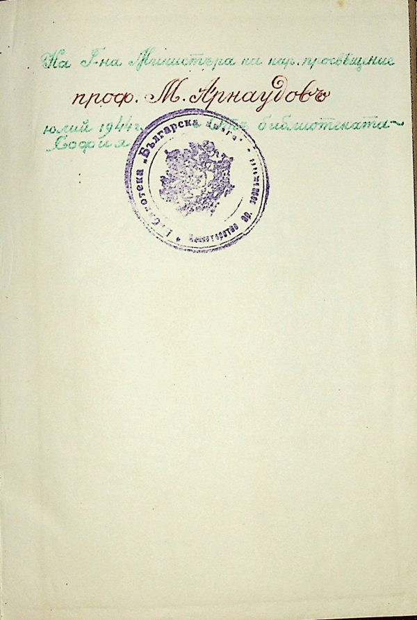 Автограф с текст На Г-на Министъра на нар. просвещение проф. М. Арнаудов юлий 1944 г. София От библиотеката (Библиотека "Бълг. книга")