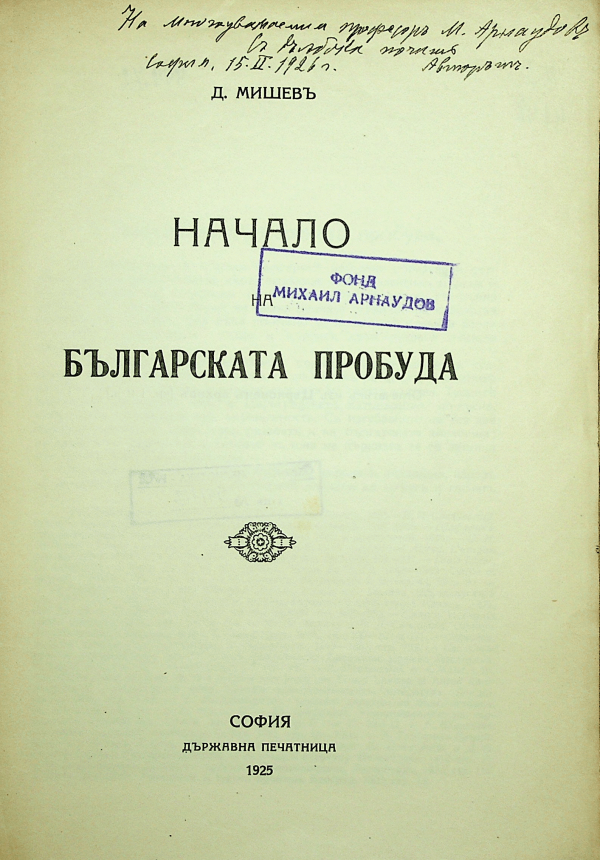 Автограф с текст: На многоуважаемия професор М. Арнаудов. С бълбока почит Авторът София, 15. II. 1926 г.