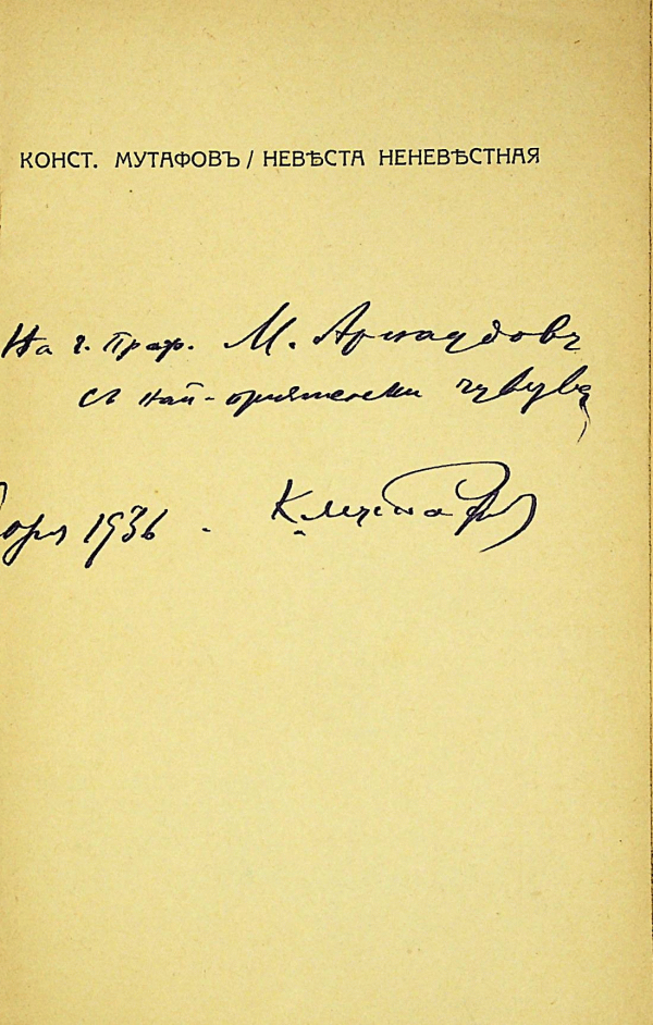 Автограф с текст: На г. Проф. М. Арнаудов с най-приятелски чувства К. Мутафов София 1936.