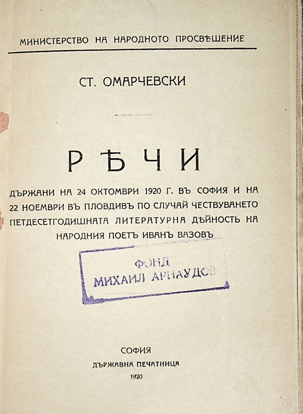 Речи, държани на 24 октомври 1920 г. в София и на 22 ноември в Пловдив по случай чествуването петдесетгодишната литературна дейност на народния поет Иван Вазов