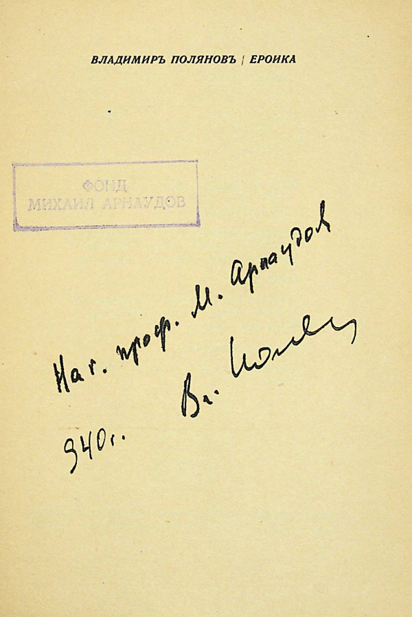 Автограф с текст: На г. проф. М. Арнаудов, 940 г., Вл. Полянов