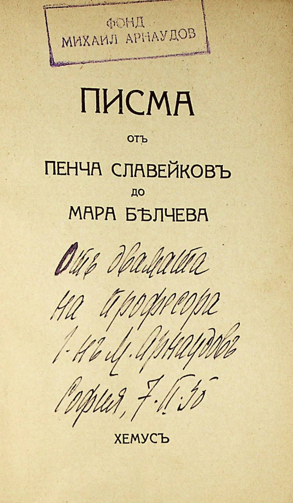 | Регионална библиотека "Любен Каравелов" Русе Фонд "Михаил Арнаудов" | МА 233 (Разгледайте рафт(Отваря се отдолу)) | Автограф: Пенчо Славейков и Мара Белчева | 1 | ползва се в читалня (без рестрикции) | 120000345099 |