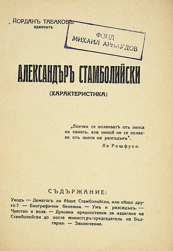 ТекстЕзик: Български Серия: Частна колекция - Академик Михаил АрнаудовПодробности за публикацията: София 1930 Описание: 64 с 18 сДруго заглавие: - Характеристика