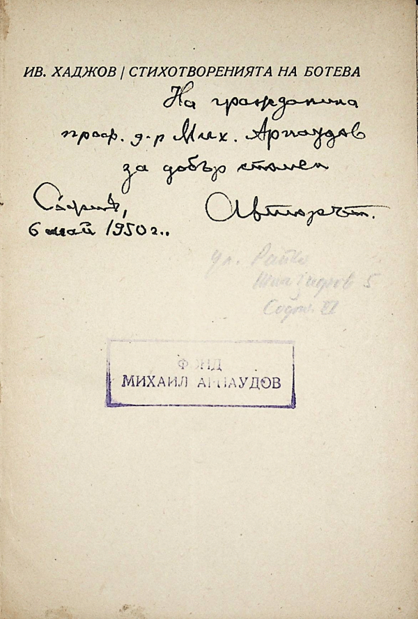 Михаил Арнаудов: негови-книга, на други лица-лист-ръкопис. - Поправки и преработки. - Добавен адресът на автора Иван Хаджов под автографа. ; Реклама за издаване на тритомника "Стихотворения на Ботева". - Автограф с текст: На гражданина проф. д-р Мих. Арнаудов за добър спомен Авторът. София, 6 май 1950 г.
