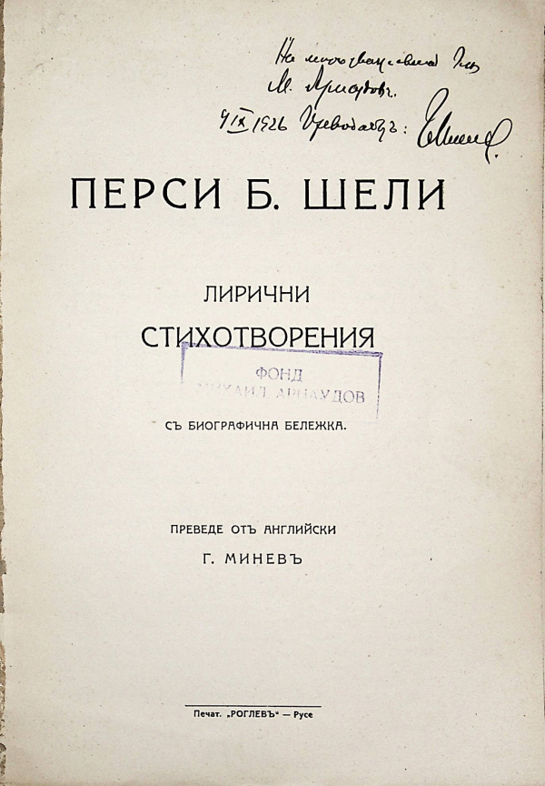 Автограф с текст: На многоуважавания Г-н М. Арнаудов. 4 IХ 1926 Преводачът: Г Минев