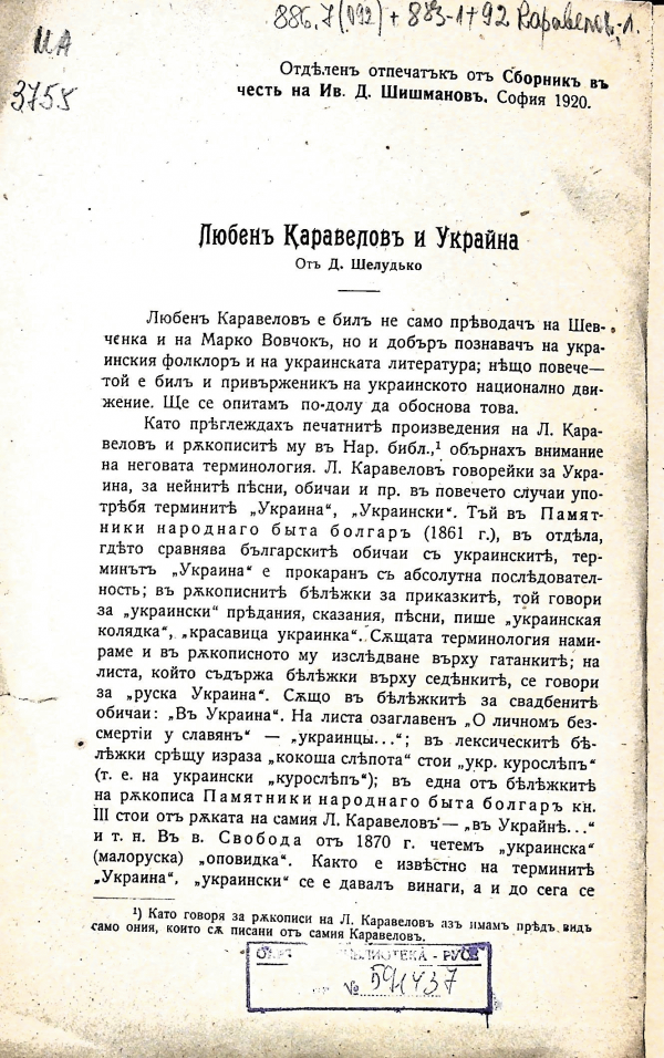 Подчертавания в текста инв.Х 591327Бележка : заглавието "Л. Каравелов и Украйна" инв.Х 591327