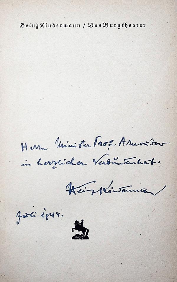 Автограф с текст: Herrn Minister Prof. Arnaudov in herzlicher Verbindlichkeit Heinz Kinderman Juli 1944