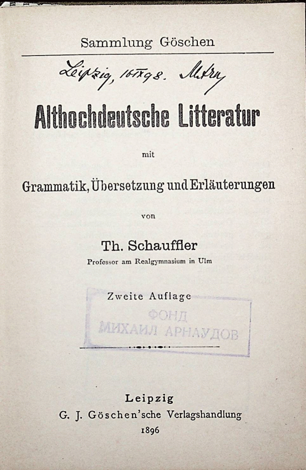 Михаил Арнаудов: негови-книга. - Михаил Арнаудов: подпис. - Датиране на книгата : Leipzig, 16 IХ 98.