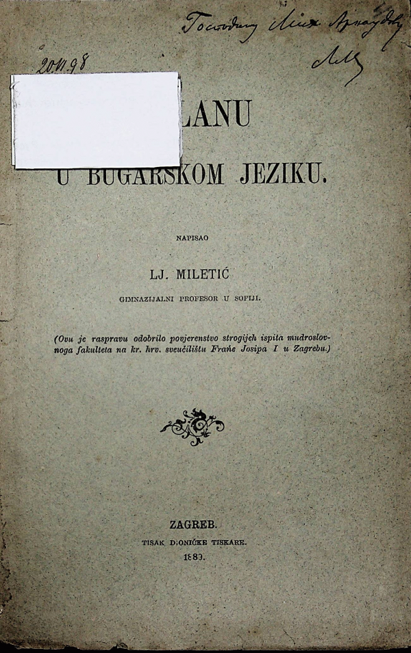 | Регионална библиотека "Любен Каравелов" Русе Фонд "Михаил Арнаудов" | МА 2404 (Разгледайте рафт(Отваря се отдолу)) | Автограф: Любомир Милетич | 1 | Специални фондове ( старопечатни, редки и ценни, фонд М. Арнаудов) (без рестрикции) | 120000588043 |