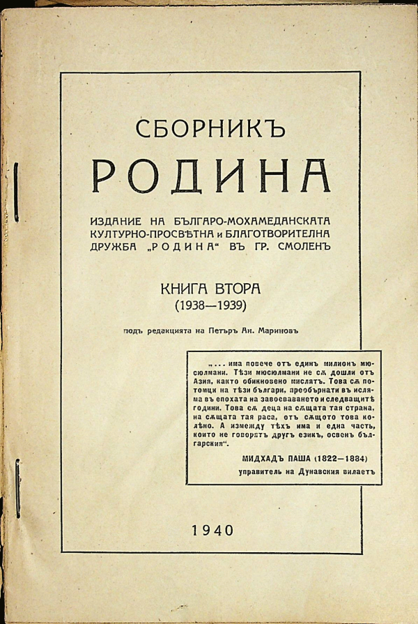 ТекстЕзик: Български Серия: Частна колекция - Академик Михаил АрнаудовПодробности за публикацията: Смолян Бълг.-мохамеданска култ.-просв. и благотвор. дружба Родина 1939 - 1941 Описание: 19 смДруго заглавие: - Сборник : Кн. 1-4 РОДИНА