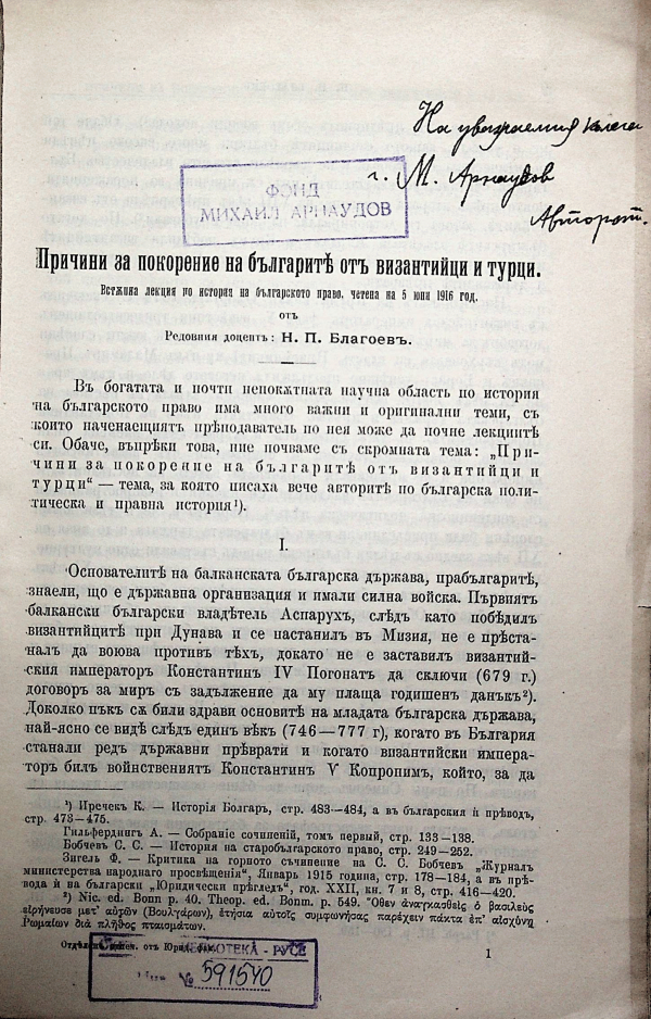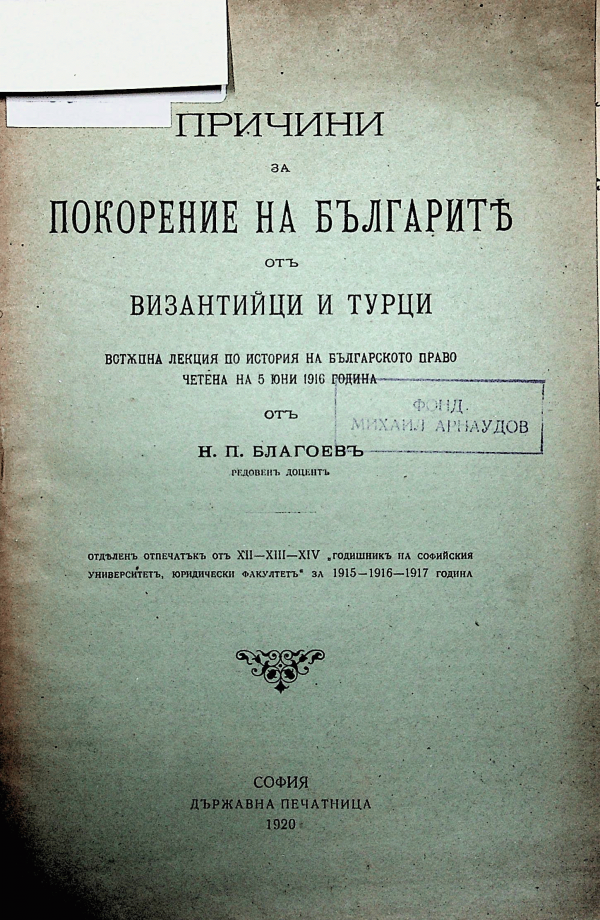 Причини за покорение на българите от византийци и турци Встъпителна лекция по история на българското право, четена на 5 юни 1916 г. Никола Попов Благоев.