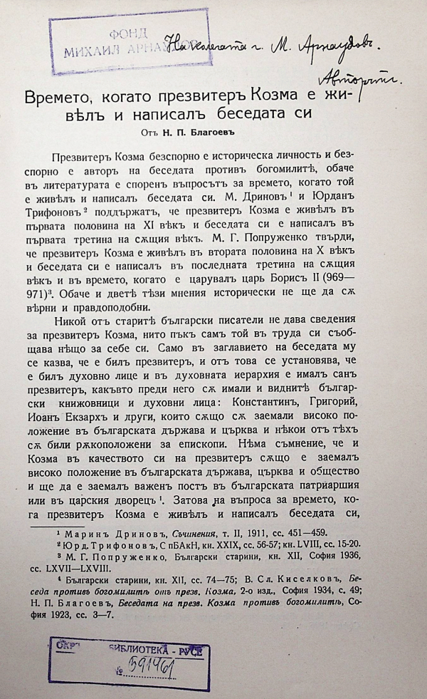 Отпеч. от Известие Бълг. ист. д-во, Т. ХVІ.ХVІІ, 1939, с. 25-29 (Сб. в памет на проф. Петър Ников. - Подпис на Михаил Арнаудов ; Допълнения в текста: с. 29 ; Автограф с текст: На колегата М. Арнаудов. Авторът. - Мека подв.