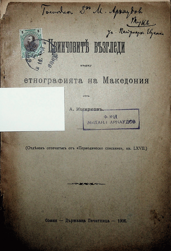 Отпеч. от Период. сп., кн. LXVII, 1912, с. 469-520. - Адрес: Господин Д-р М. Арнаудов Тус ул. Патриарх Евтимий. - Мека подв.