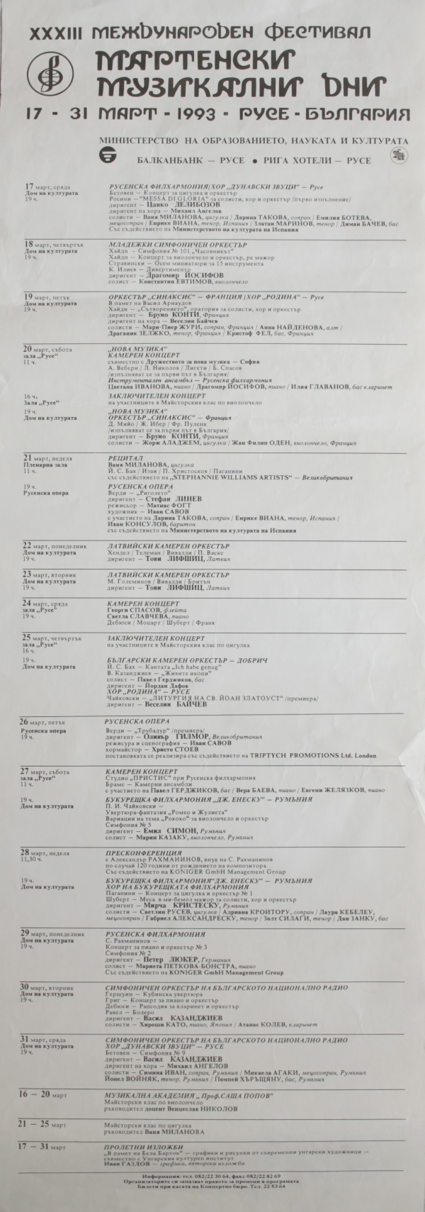 ХХХIII международен фестивал Мартенски музикални дни 17-31 март - 1993 - Русе - България; Програма [Изобразителен материал] Плакат