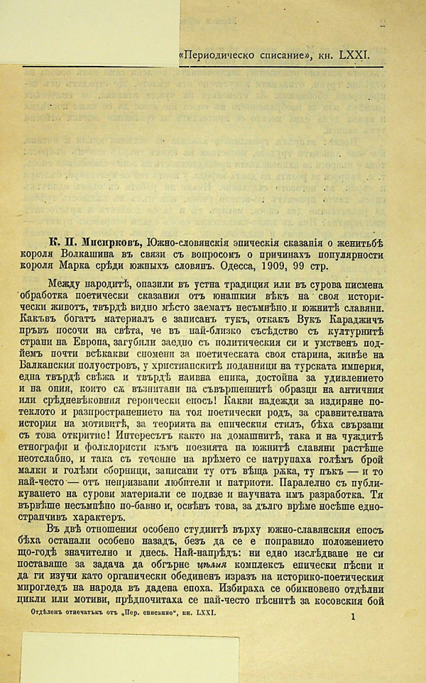 [Кръсте Петков] К. П. Мисирков Южно-словянскiя сказанiя о женитьбе короля Волкошина в связи с вопросом о причинах популярности короля Марка среди южных словян : Рец. Михаил Петров Арнаудов.