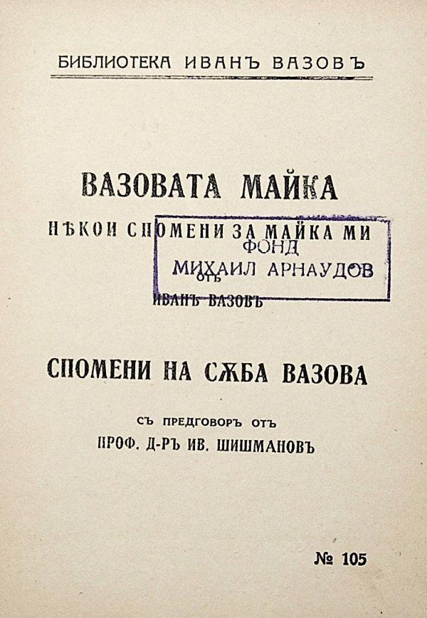 Вазовата майка Някои спомени за майка ми : Спомени : Съба Вазова Иван Минчов Вазов; предг. от Иван Димитров Шишманов.